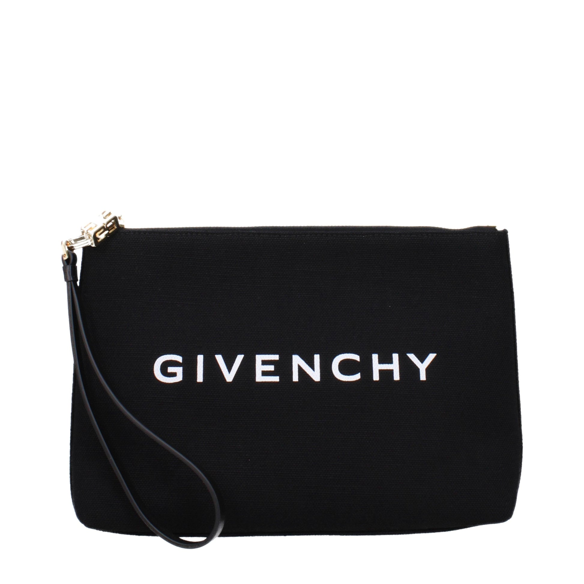 Refined yet impactful, this Givenchy clutch bag is crafted from premium black canvas and adorned with the iconic white Givenchy logo embroidery. Its minimalist aesthetic is elevated by gold-tone hardware and a detachable leather wrist strap for versatile carry options.