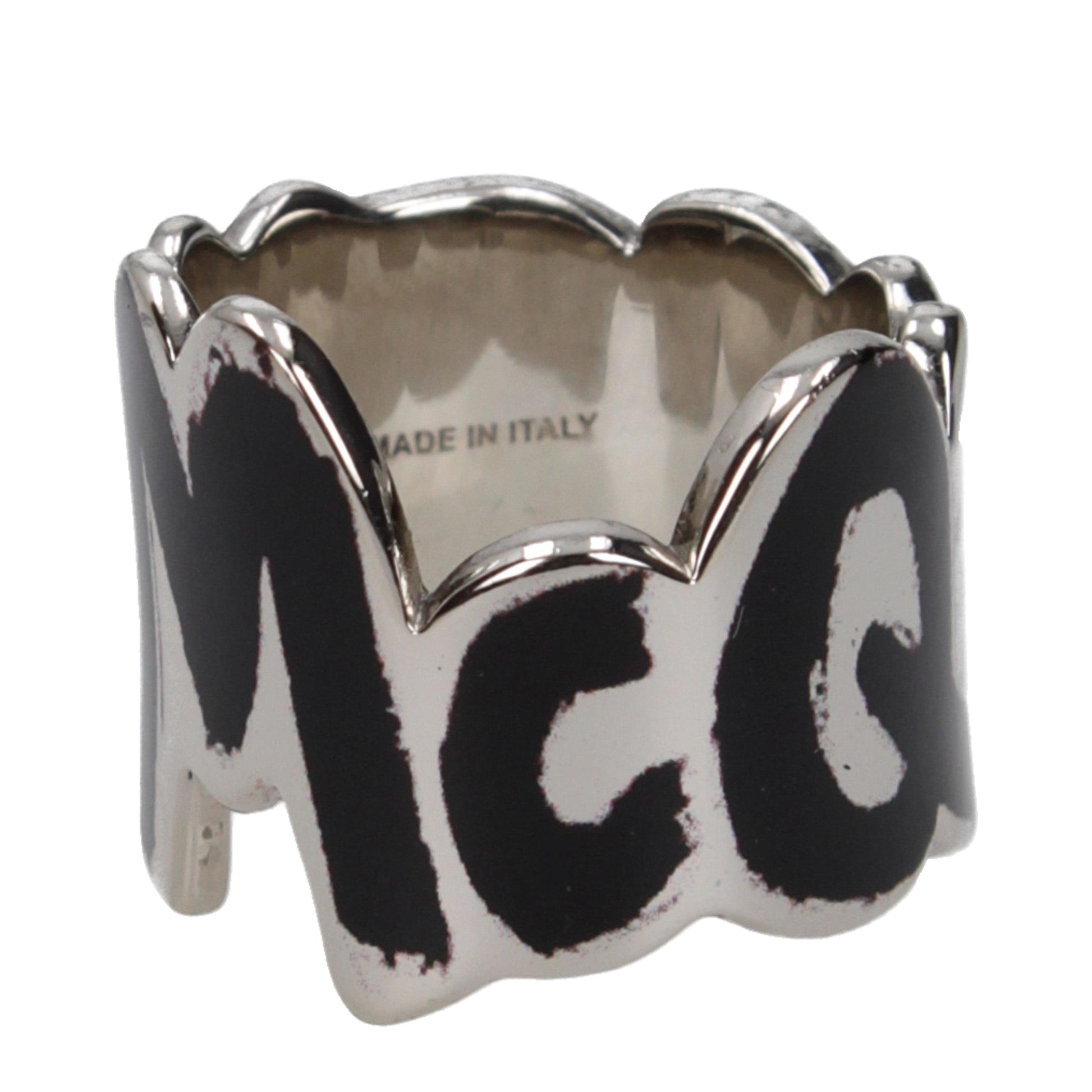 Crafted in Italy from high-quality metallic silver-tone alloy and finished with a contrasting black enamel inlay, it delivers raw energy and unmistakable luxury. The inner band is engraved with the Alexander McQueen logo — a mark of authentic design excellence.